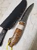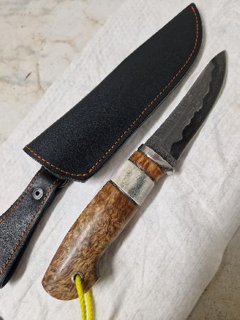 Exklusiv Exemplar. Private Schmiedekunst. Materialien: Pulverstahl S390 HRC- 68, Nickeldamast, Karelbirke und Mammutzahn am Griff. Scheide aus Italienische Sattelleder. Reine Hinterglassgucker, nie benutz. Privat Verkauf.