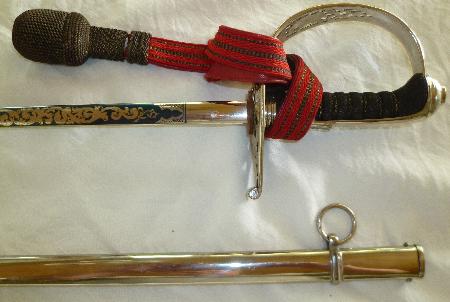 1 LUXUS Offizier - Gala Degen, Mod. 1889, der Sonderklasse. Wurde im Auftrag Jahre 1947in Solingen hergestellt. (Herstellerzeichen, "Helm") ev. Weihersberg &Kerschbaum Die Klinge ist beidseitig grosszügig graviert und gebläut. Inder Mitte Schweizer Kreuz. Grosses Off. Schlagband, innen mit rotem Leder versehen, altes Model mit Silbereichel.