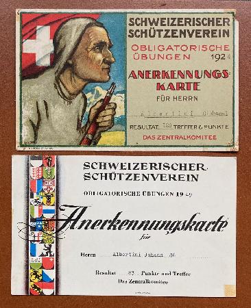 Schweizerischer Schützenverein (2 Sammlerkarten) Originale Anerkennungskarten. Seltene Sammlerstücke mit historischem Wert! Die Karten weisen leichte Gebrauchsspuren auf. Ideal für Sammler von Militaria, Schützenvereine oder Geschichtsinteressierte. - Obligatorische Übungen 1924, Anerkennungskarte  - Obligatorische Übungen 1949, Anerkennungskarte Privatverkauf: keine Garantie und keine Rücknahme. Twint auf Anfrage möglich. Zuzüglich Versandkosten: CHF 1.50