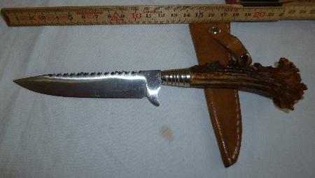 Nachlassauflösung: Neuwertiger Jagdnicker, Klinge zus. mit Sägerücken, Griff echtes Rehgehörn mit Rose.