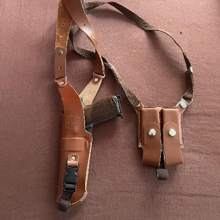 Ich Verkaufe für einen Freund, ein Leder-Schulterholster passend zur SIG 210 und 2 Reservemagazinen. Dieses Holster würde sicher auch für andere Pistolen mit ähnlichen Abmessungen und Einreihigen Magazinen gehen, müsste allerdings getestet werden. Die Pistole im Schulterholster auf dem Foto, ist nicht im Lieferumfang und dient nur zur Illustration, ist aber in einer anderen Auktion von mir zu Erwerben!