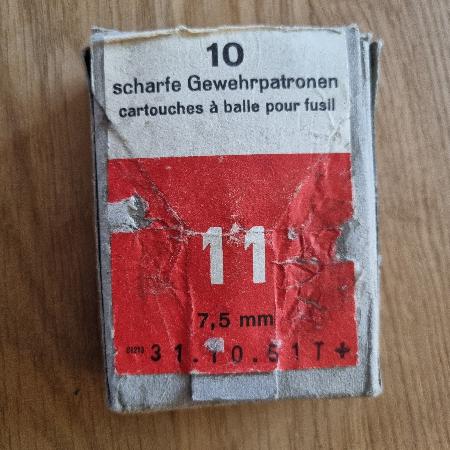 1 Originalschachtel CH-Armee (10 Schuss) Gewehrpatrone Kal. 7.5mm GP11 / Jg. 1951 Thun / OVP - gemäss Bild - Privatverkauf: keine Garantie und keine Rücknahme. Twint auf Anfrage möglich. Zuzüglich Versandkosten: CHF 9.00