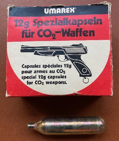 12g Spezialkapseln für CO2-Waffen Capsules spéciales pour armes au COO2 special 12g capsules for CO2 weapons Marke: Umarex, Sportwaffen GmbH+Co. vorhanden: 1 Schachtel à 10 Kapseln Achtung: Vor Sonne und Hitze schützen. Kühl und trocken lagern. Privatverkauf: keine Garantie und keine Rücknahme. Twint auf Anfrage möglich. Zuzüglich Versandkosten: CHF 8.50