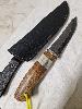 Exklusiv Exemplar. Private Schmiedekunst. Materialien: Pulverstahl S390 HRC- 68, Nickeldamast, Karelbirke und Mammutzahn am Griff. Scheide aus Italienische Sattelleder. Reine Hinterglassgucker, nie benutz. Privat Verkauf.