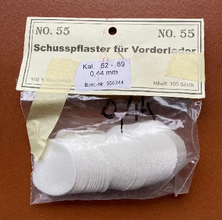 Schusspflaster für Vorderlader Kal. .62-.69, 100% Baumwolle Stärke: 0.44mm (1x angefangene Packung) Privatverkauf: keine Garantie und keine Rücknahme. Twint auf Anfrage möglich. Zuzüglich Versandkosten: CHF 2.00