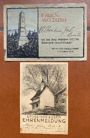 Stoss (2 Sammlerkarten) Stoss Schützenverband, Ehrenmeldung 1932 Stoss-Schiessen, Ehrenmeldung 1937 Zwei originale Ehrenmeldungen. Seltene Sammlerstücke mit historischem Wert! Die Karten weisen leichte Gebrauchsspuren auf. Ideal für Sammler von Militaria, Schützenvereine oder Geschichtsinteressierte. Privatverkauf: keine Garantie und keine Rücknahme. Twint auf Anfrage möglich. Zuzüglich Versandkosten: CHF 1.50