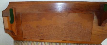 Nachlassauflösung: Zum Gebot: Wandhalterung für 1 Langwaffe, zB. Winchester, Holzrahmen, in der Mitte Ledereinsatz mit der Prägung einer Western -Postkutsche. Guter Zustand.