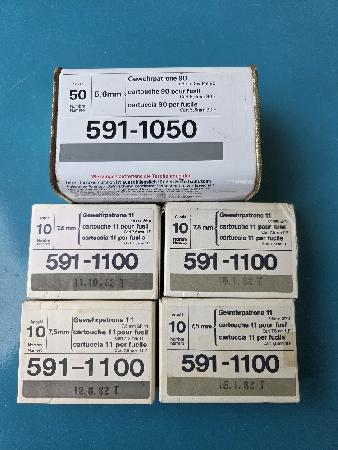 Hier eine Blechschachtel mit 50 Patronen 5,6mm und 3 Pakete à 10 Patronen GP 11.