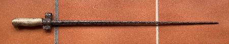 Originales französisches Degen-Bajonett Lebel (antik) Epée-Baïonnette française originale Lebel, probablement pour le fusil Mle 1886 Klingenlänge/longueur de lame: 518mm Degenklinge/lame d’épée: vierkant/format carré Klingendurchmesser: 14.2mm Gesamtlänge/longueur totale: 637mm Parierstange: kein Parierhaken/sans garde Griff:Messing mit Längsnut/laiton avec cannelure; Griffkopf verschraubt/tête de poignée vissée Privatverkauf: keine Garantie und keine Rücknahme. Twint auf Anfrage möglich. Zusätzliche Versandkosten: CHF 12.00 Abholung möglich.
