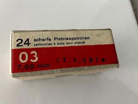 Ein Paket Sammlermunition Parabellum 7.65, Jahrgang 1949, Paket ist geöffnet, aber vollständig. Keine Garantie auf Funktion! Kein Versand ins Ausland, Porto 3.40