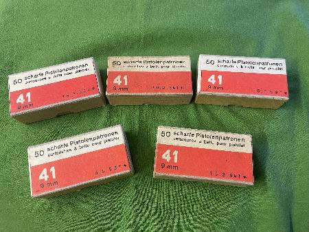 5 Pakete à 50 Patronen 9 mm (P41)k total 250 Stück, 3 Pakete ungeöffnet, 2 geöffnet aber vollständig, Verkauf an Berechtigte, kein Export