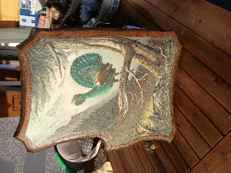 wunderschönes Jägerbild balzender Auerhahn Oel auf Holzplatte signiert und datiert von 1946 Grösse: 51 x 39 x 2,5 cm hinten Aufhängevorrichtung